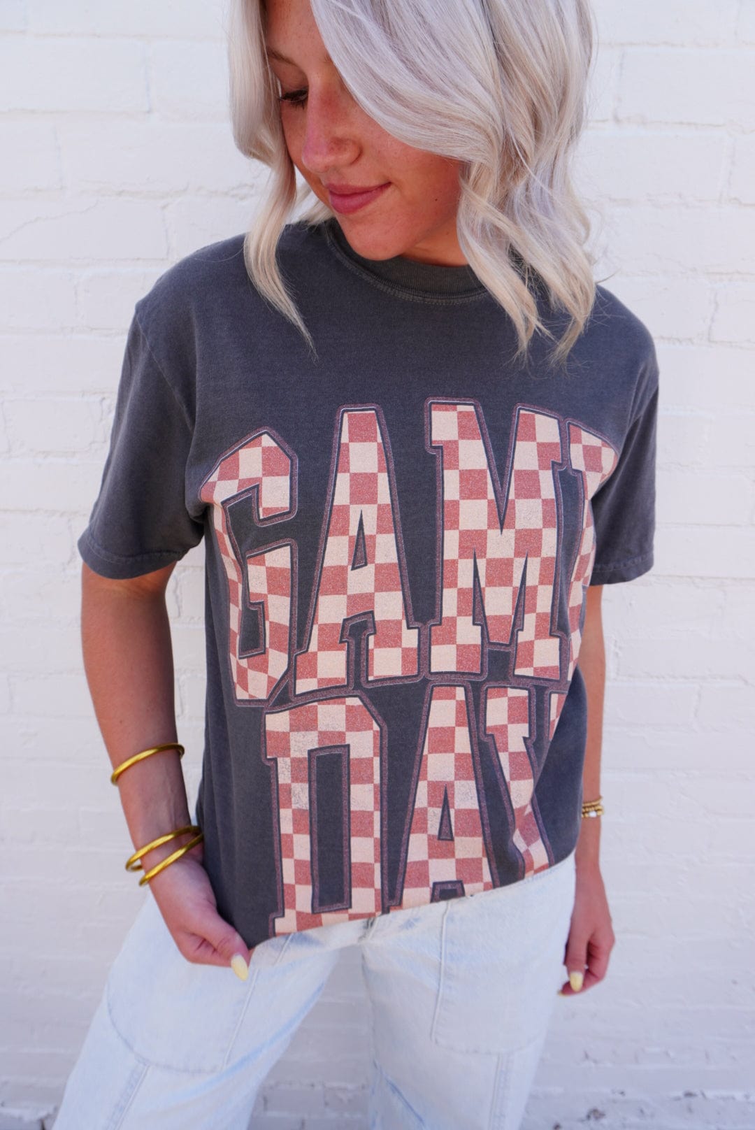 Show your game day spirit with the Checkerboard Game Day Tee in Pepper. Featuring a bold checkerboard pattern, this tee combines style and comfort effortlessly. Perfect for cheering on your team or casual outings, its soft fabric ensures all-day comfort in the beloved Comfort Color brand. Elevate your fan gear with a unique twist that stands out in the crowd.