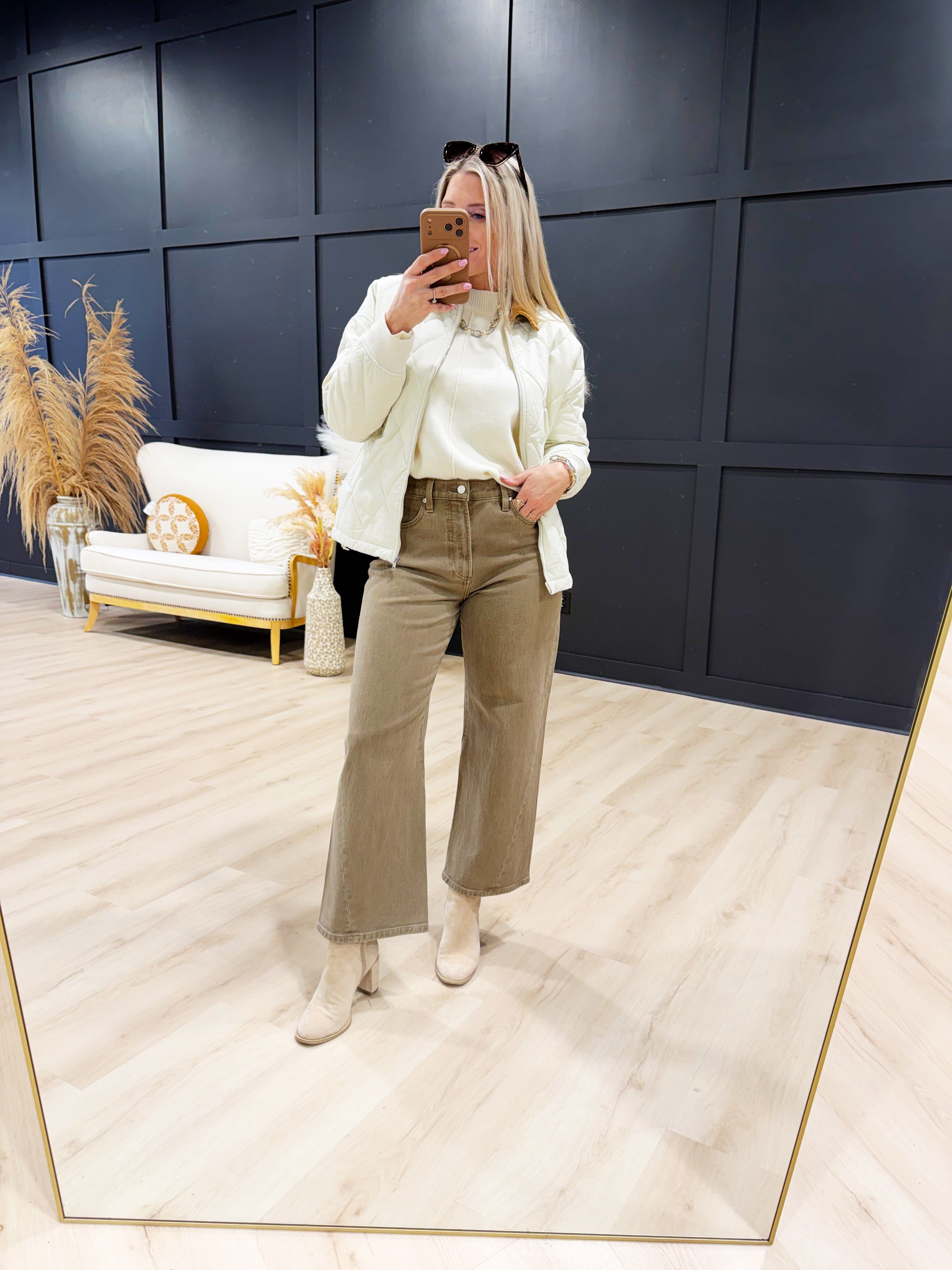 The Corduroy Collar Quilted Zip-Up Jacket in Ivory brings all the laid-back, easygoing vibes you love with a touch of vintage charm. Designed with a classic quilted pattern, metal zip front, and soft corduroy collar, it’s the perfect blend of comfort and style. The colorblock details and practical pockets make it both fun and functional, whether you’re running errands, heading to brunch, or layering up for a chilly outdoor stroll. Throw it on with leggings and sneakers for a comfy-cute look, or pair it with jeans and booties for effortless everyday style. Warm, lined, and endlessly wearable, this jacket is your new favorite grab-and-go layer.
