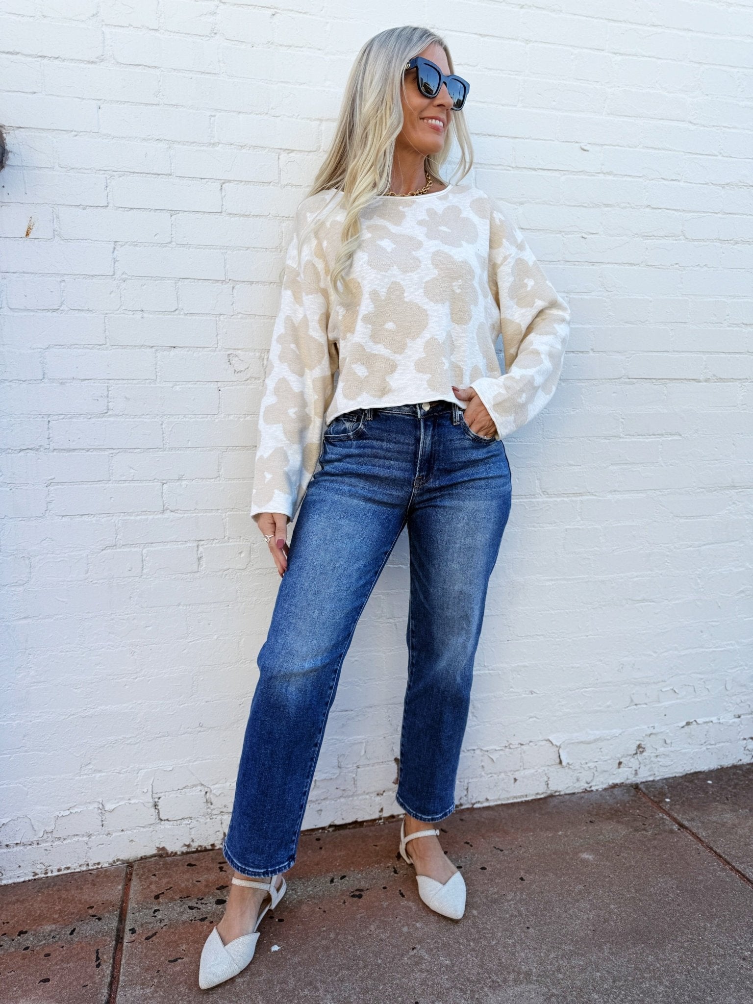 This floral top pairs a soft oatmeal background with bold ivory flowers for a striking yet versatile look. The relaxed silhouette is enhanced by wide, easy-fitting sleeves that bring a breezy, modern touch. Finished with a slightly cropped, raw like rolled hem, it has a laid-back, effortless vibe that feels casually chic. Perfect for pairing with denim or trousers, this top transitions seamlessly from everyday wear to a more polished outing with simple accessory changes.
