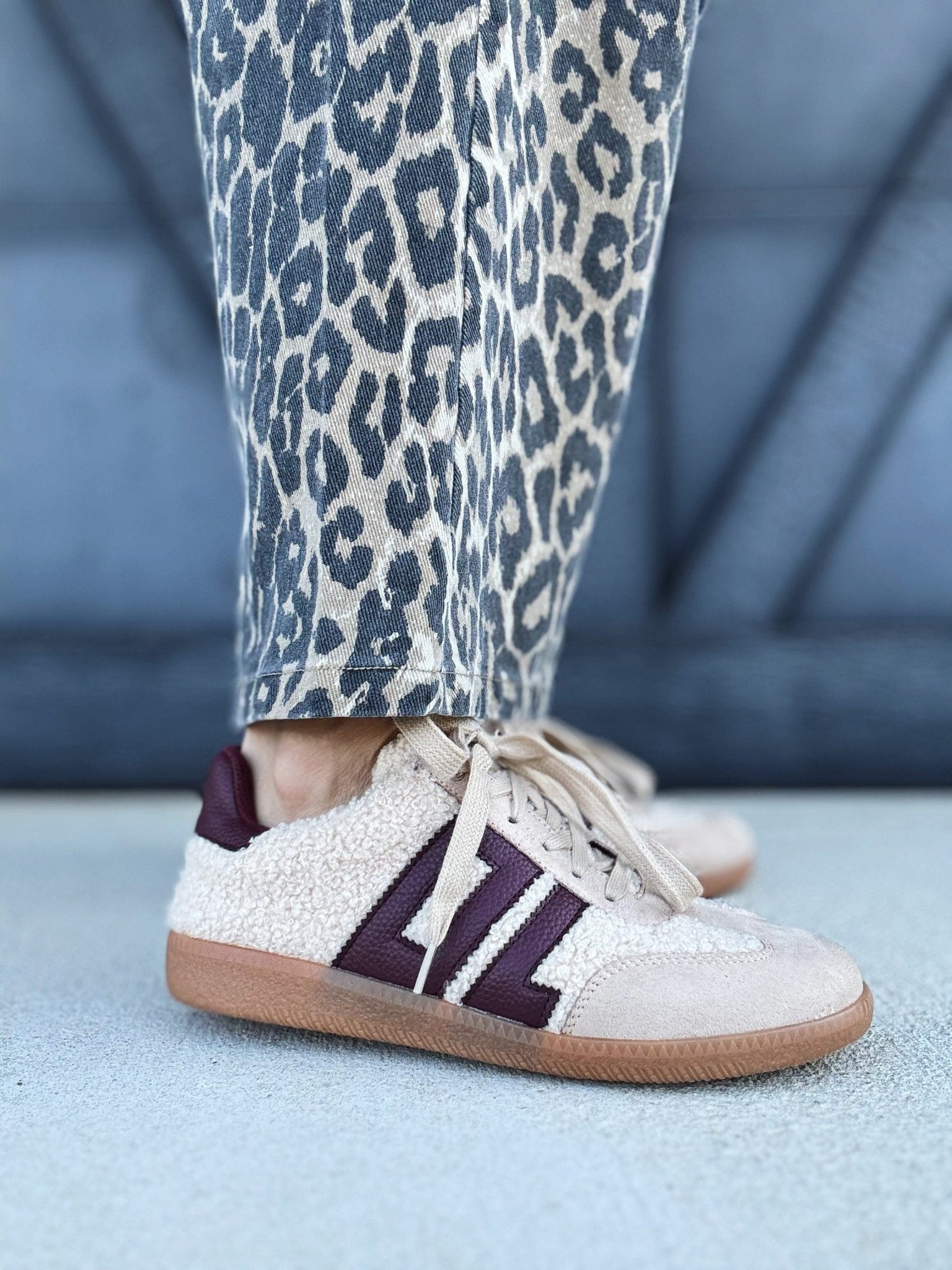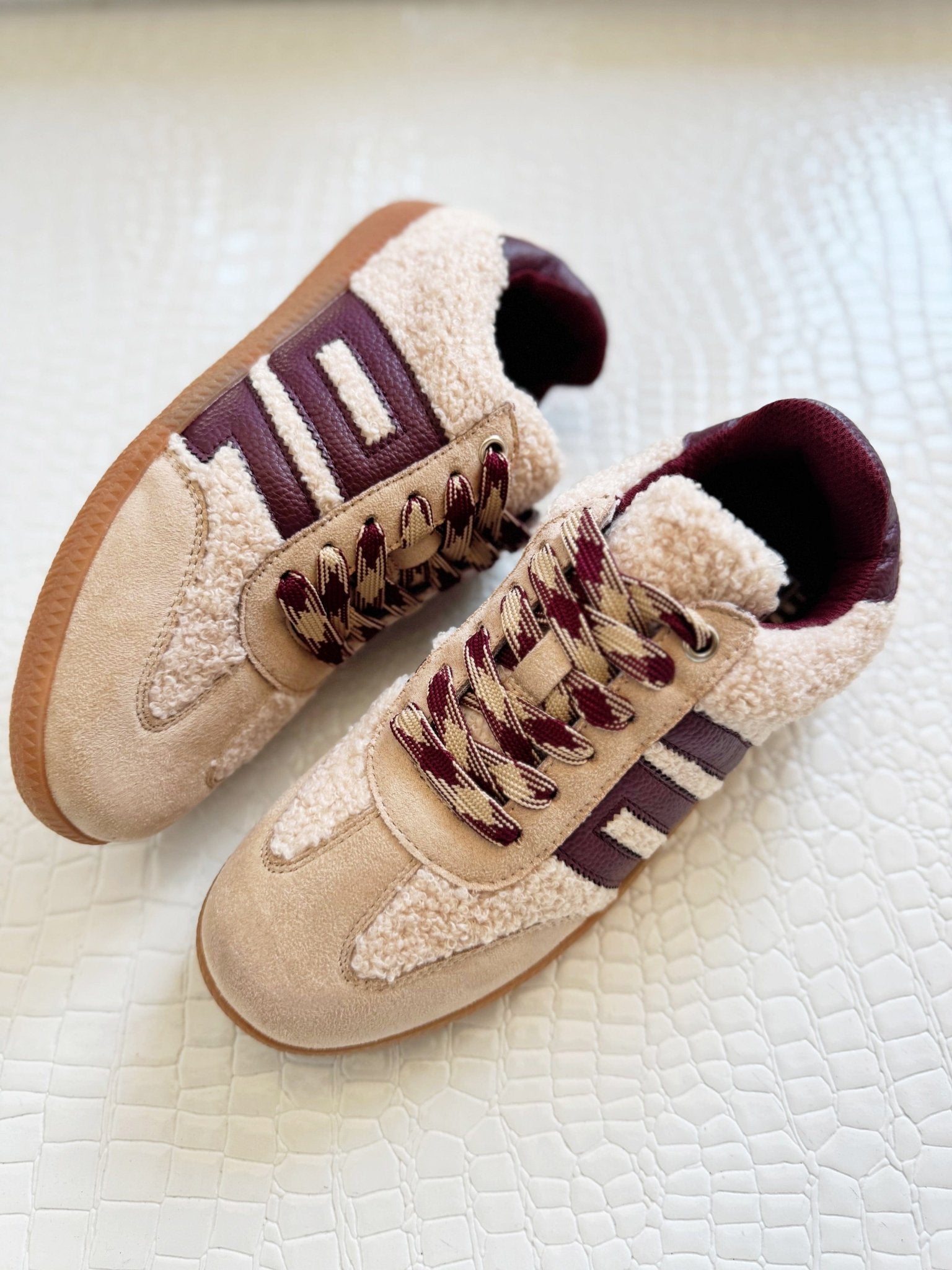 Step into cozy-chic style with the Dirty Laundry Sneakers in Taupe Multi. Designed with a mix of textures and neutral tones with a pop of a dark mauve/burgundy color, these sneakers feature plush shearling fur accents for a soft, elevated touch. The lace-up front keeps them classic, while the sole adds both comfort and a modern edge. Perfect for pairing with jeans, joggers, or casual dresses, these sneakers bring a stylish blend of warmth and streetwear flair to your everyday look.