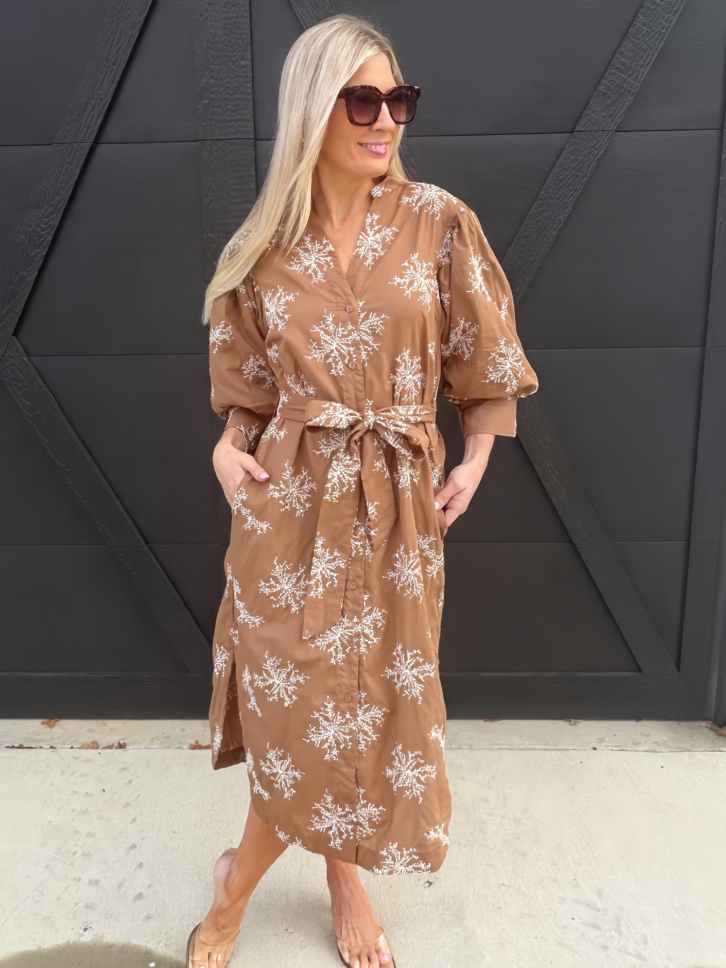 Effortlessly chic with a timeless feel, the Embroidered Belted Shirt Dress in Mocha is the perfect blend of comfort and style. Designed with a classic button-down front and a self-tie belt, it cinches at the waist for a flattering silhouette while maintaining a relaxed fit. Voluminous three-quarter sleeves add an elevated touch, and delicate embroidery throughout brings subtle femininity and texture. Finished at a midi length, this versatile dress transitions seamlessly from workdays to weekend outings. Wear it with boots for a polished look or dress it down with flats for everyday ease.