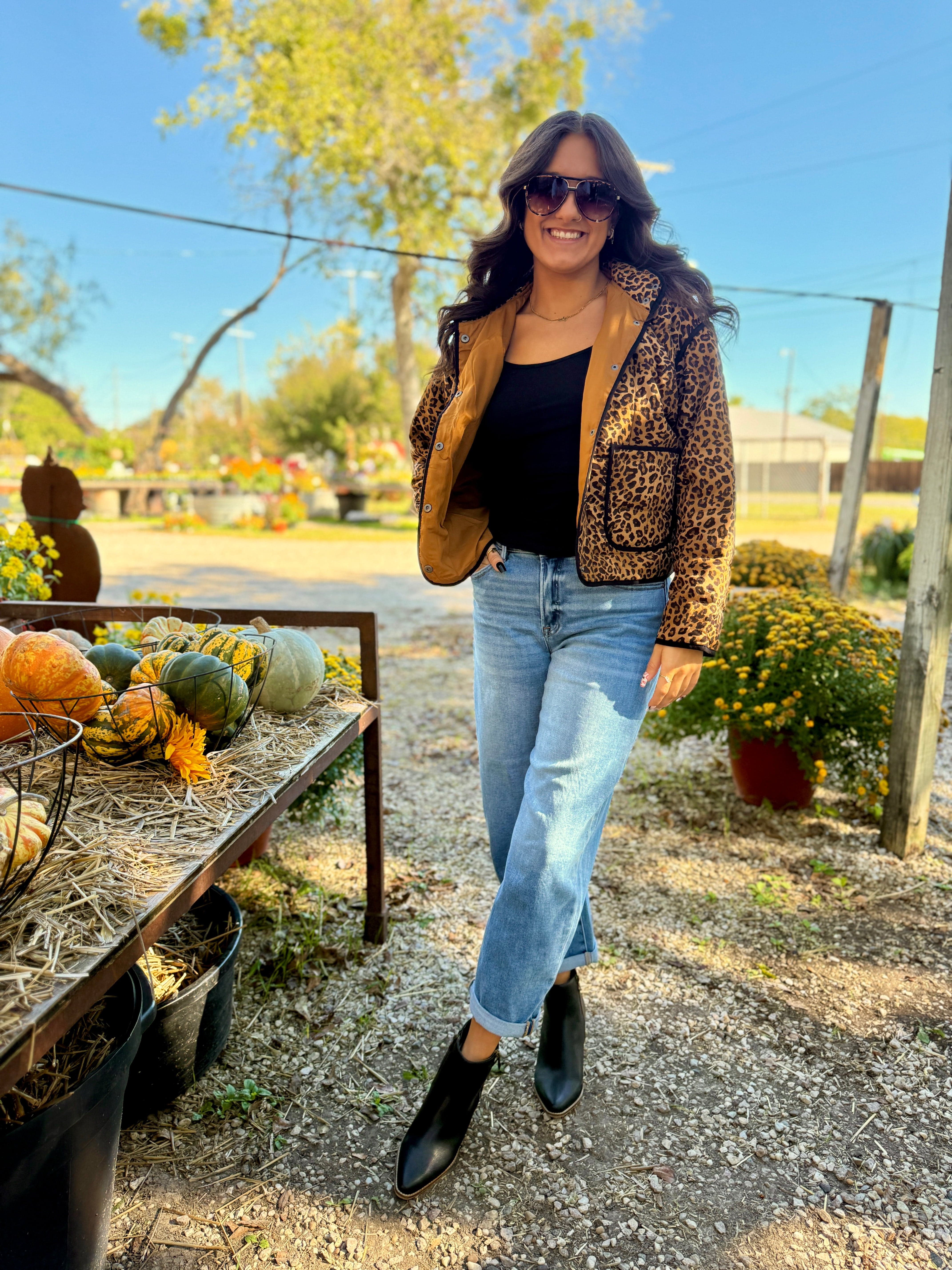 Stay warm in style with this eye-catching brown leopard print quilted puff jacket. Designed with a classic collar and snap closures for easy wear, it combines practicality with bold fashion. Front patch pockets add both utility and a casual-chic touch, while the thin quilted construction provides cozy insulation. Perfect for layering, this jacket elevates any casual outfit with a playful, on-trend print.