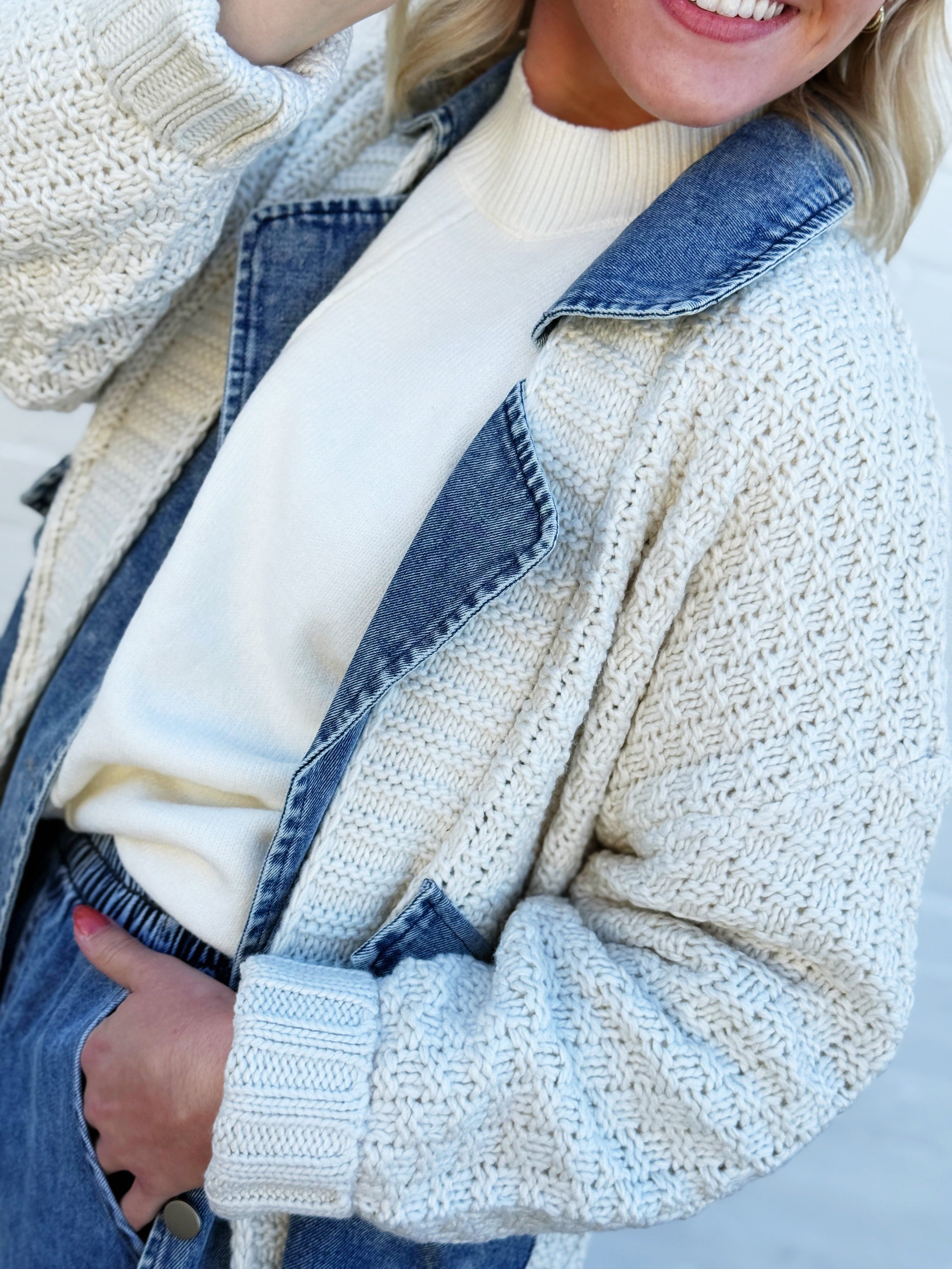 This mixed-media cable knit jacket combines classic charm with modern detailing. Featuring a collared neckline, long sleeves, and a button-down front, it offers a polished yet cozy silhouette. Functional denim pockets and denim collar add contrast and practicality, while the unlined design keeps it lightweight and perfect for layering. Ideal as a statement outerwear piece, it effortlessly pairs with both casual and polished ensembles.