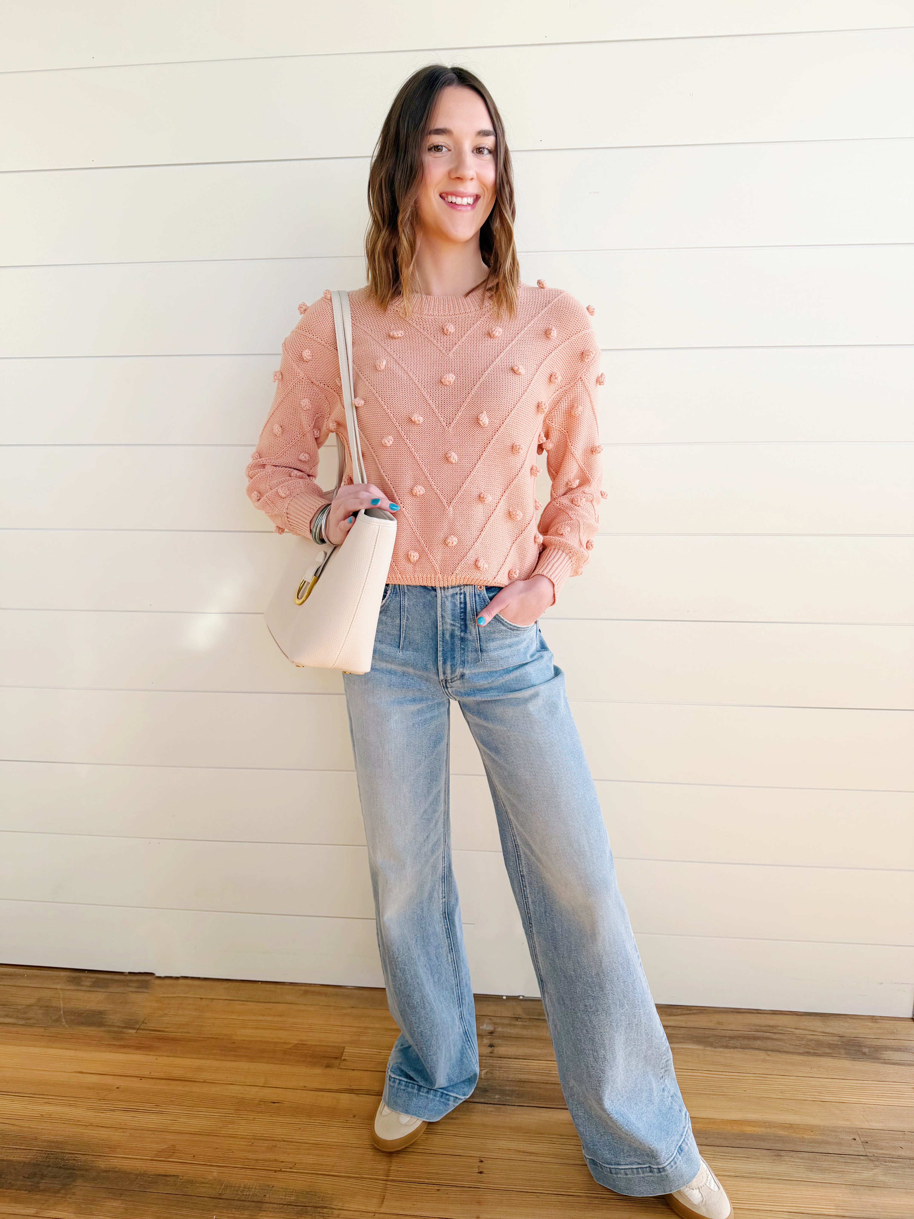 Add a touch of romance to your everyday knitwear with our Pom Pom Textured Knit Sweater Top in Blush. Designed in a classic crewneck silhouette, this sweater features delicate pom pom texture throughout for a playful, dimensional look. Soft blush tones and subtle stitched detailing make it the perfect piece for Valentine’s Day and beyond. Finished with a cuffed hem for a polished fit, it’s cozy, charming, and effortlessly stylish—easy to dress up or down for sweet date nights or casual days out.