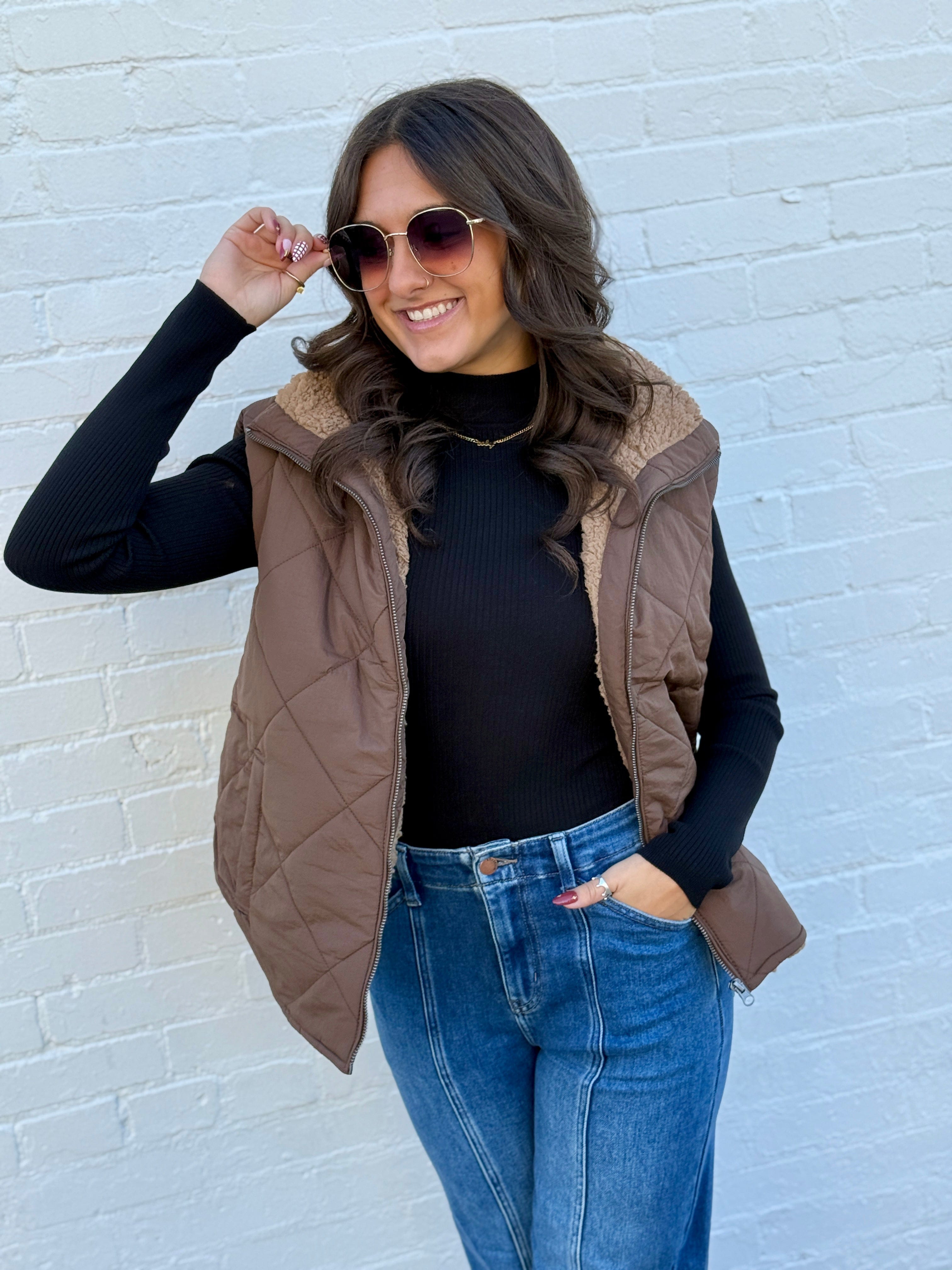 Quilted Fleece Lined Zip Up Puffer Vest In Dark Brown
