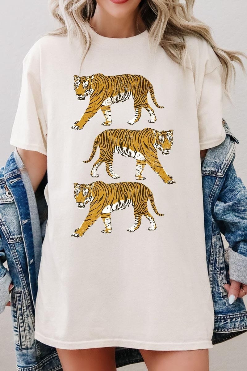 Vintage Vibes with a Fierce Edge. This sand-colored tee features a bold retro-inspired tiger graphic that blends old-school charm with modern style. Perfect for casual weekends, concerts, or lounging in effortless comfort, it adds a statement-making touch to any laid-back look. Pair it with distressed denim and sneakers for a relaxed vibe, or tuck it into a skirt with boots for a cool, edgy twist. Made from a soft cotton fabric, it’s designed for all-day comfort while keeping your style sharp. The Retro Tigers Graphic Tee in Sand is the easygoing piece that brings a touch of wild energy to your wardrobe.