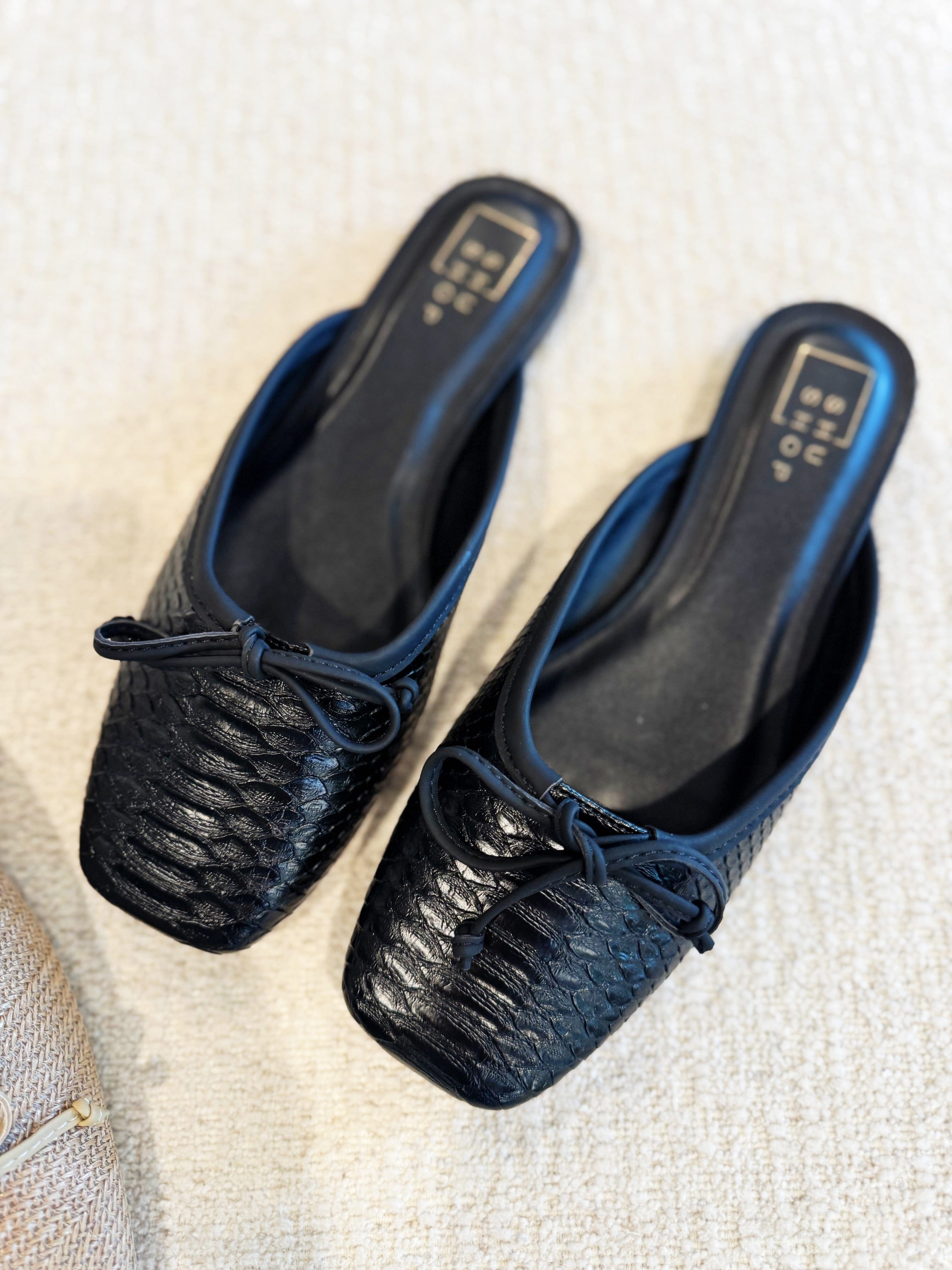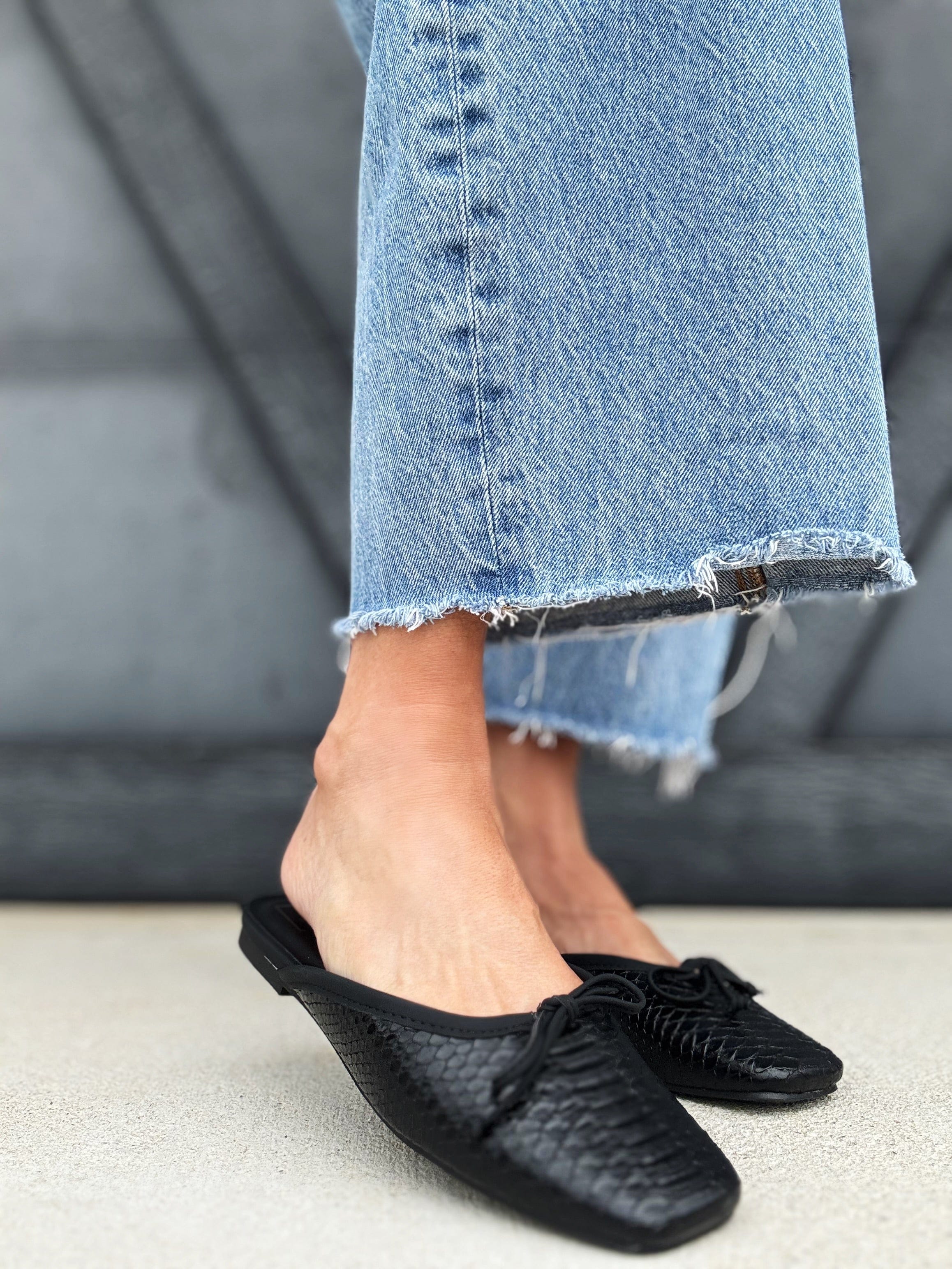 Elevate your everyday look with the Shu Shop Andrea Mule in Black Snake. Featuring a sleek square toe, a bold snake-embossed texture. This slip-on mule adds instant edge and sophistication to your wardrobe. The versatile black snake finish gives it a modern twist. Dress it up with tailored trousers and a blouse for a polished, work-ready look or pair with a midi skirt or slip dress to add an unexpected pop of texture and trend-forward edge.
