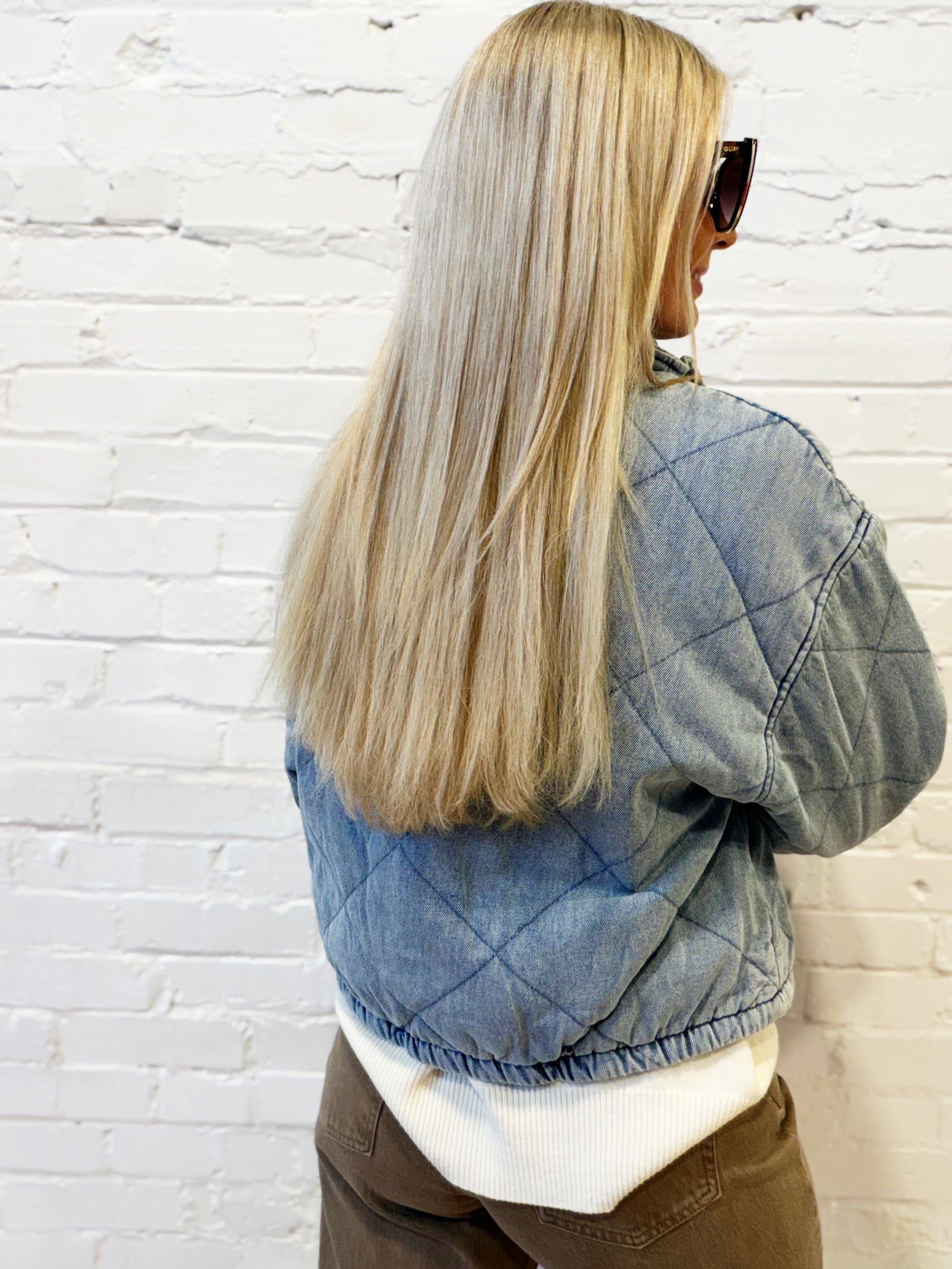 Stay on-trend and warm with this acid-wash quilted denim jacket, featuring a mock neckline, long sleeves, and a diamond quilted pattern for a modern, textured look. Snap buttons and a front tie strap add stylish detail, while the elastic hem and practical pockets keep you cozy and functional. Perfect for layering over casual outfits, you can wear it with jeans and sneakers for a relaxed weekend vibe, or pair it with leggings and boots for a chic, street-ready look. Lightweight yet insulating, this jacket is a versatile piece that adds effortless style to any wardrobe.